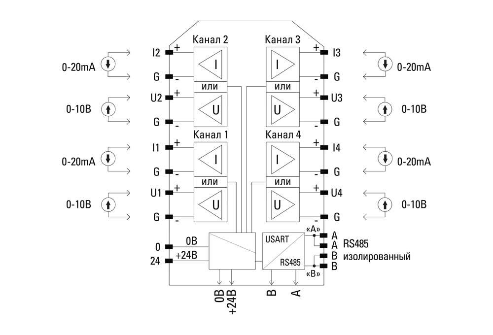 Модуль аналогового вывода «K15.AO4.RS» предназначен для формирования сигнала токовой петли в диапазоне 0-20 мA и напряшения в диапазоне 0-10 В. Может использоваться как отдельное устройство без процессорного модуля.