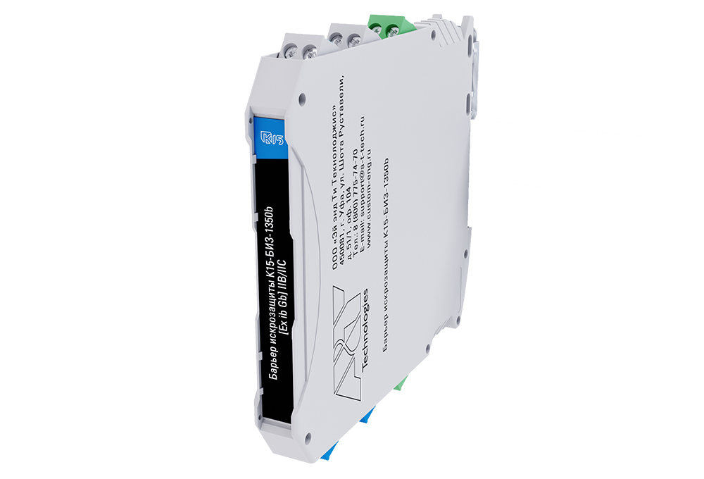 Барьер «К15-БИЗ-1350b» предназначен для обеспечения искробезопасности электрических цепей, устанавливаемых во взрывоопасных зонах помещений и наружных установок. Барьер является двухканальным изделием.
