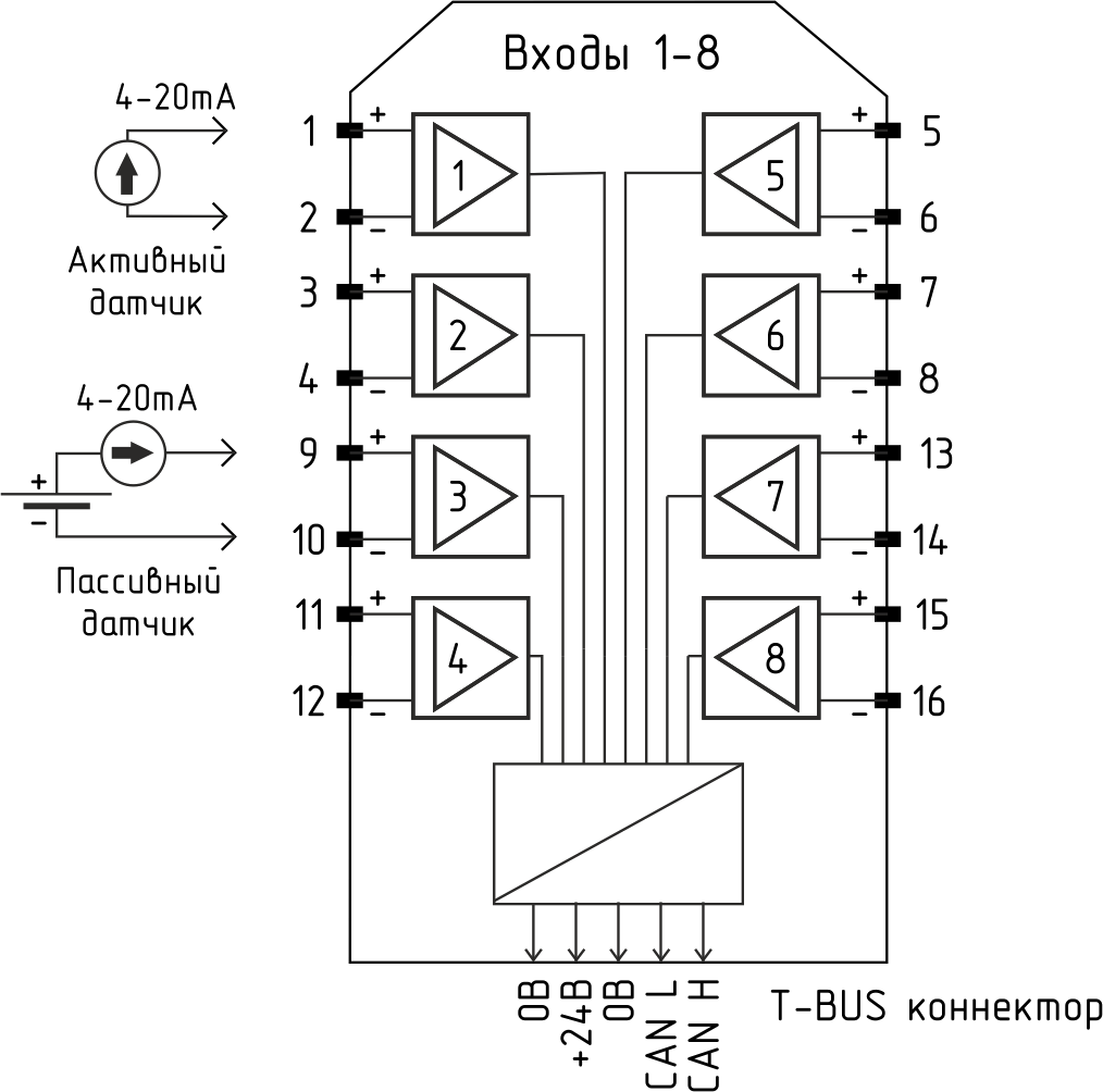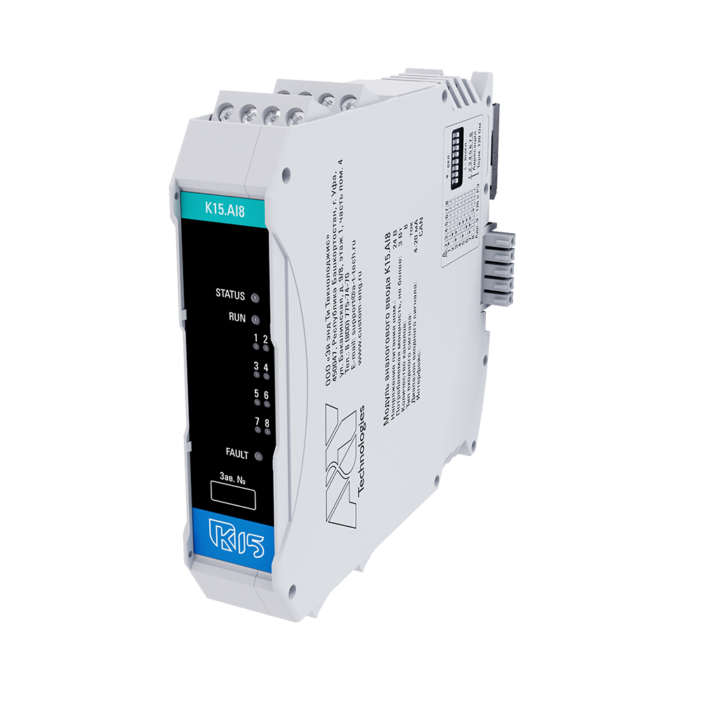 Модуль аналогового ввода «K15.AI8» применяется совместно с процессорным модулем для увеличения числа каналов аналогового ввода. Диапазон входного сигнала 4-20 мА.